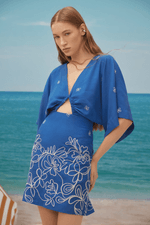 O Vestido curto, confeccionado em linho, possui bordados, mangas curtas amplas, decote em V, recorte vazado e franzimentos frontais, zíper traseiro e fechamento por botão nas costas. O vestido curto em linho une a sofisticação natural do tecido ao charme artesanal dos detalhes.