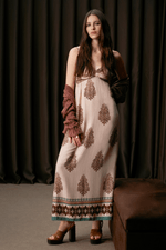 O Vestido estampado, de comprimento longo, possui decote em coração com recorte vazado no busto e detalhes em metal, alças finas reguláveis, lastex traseiro e saia fluida. O vestido estampado é uma peça única leegante e versátil, perfeita para todas as ocasiões.