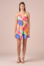 O Vestido, de comprimento curto, possui decote em V com amarração abaixo do busto e franzimento, alças finas cruzadas nas costas e babados na barra. Uma peça fresca e casual, perfeita para dias mais quentes.