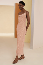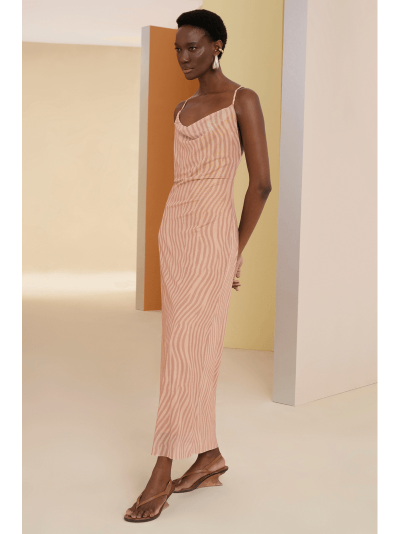 O Vestido longo apresenta decote degradê, alças finas cruzadas nas costas, amarração traseira e modelagem justa ao corpo. O vestido longo se destaca com seus detalhes marcantes, criando um visual impactante e cheio de personalidade.