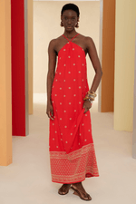 O Vestido longo apresenta decote halter com alças finas reguláveis e fenda traseira na barra. Rico em detalhes, o vestido longo é ideal para ser usado de dia ou de noite.