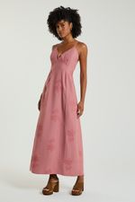 O Vestido, de comprimento longo, possui decote em V com recortes no busto, alças finas, recorte vazado traseiro com transpasse, zíper traseiro para fechamento e bordados em seu comprimento. Além de agregar charme, o bordado adiciona profundidade e requinte às roupas, tornando-as ideais para looks casuais com personalidade ou produções mais sofisticadas.