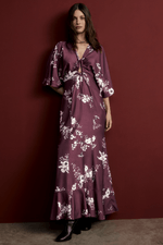 O Vestido longo, de estampa floral, possui decote em V com recortes e franzimentos no busto, mangas curtas amplas, recorte vazado traseiro e zíper traseiro para fechamento. O vestido estampado é uma opção versátil, com uma padronagem delicada e romântica, perfeita para o dia ou noite.