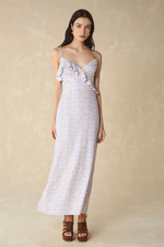 O Vestido longo, de estampa floral, possui decote em V, babados frontais, alças finas reguláveis e lastex nas coisas. O vestido longo é um modelo versátil, que transita bem entre ocasiões casuais e produções mais elaboradas.