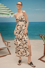 O Vestido longo apresenta decote em coração com recortes no busto, alças finas reguláveis, lastex traseiro e fenda lateral na barra. O vestido longo estampado traz leveza ao visual com um toque de elegância.