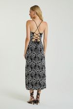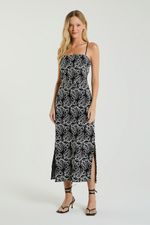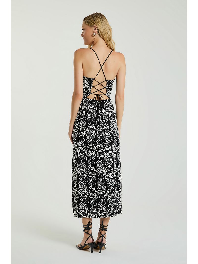 O Vestido, de comprimento midi, foi confeccionado em laise bordado, possui decote reto, alças finas cruzadas e trançadas nas costas e fenda lateral na barra. O vestido midi se destaca pelos detalhes marcantes, criando um visual impactante e cheio de personalidade.