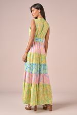 O Vestido, de comprimento longo, possui decote em V, mix de estampas e alças largas. Uma opção ideal para ser usada em dias casuais.
