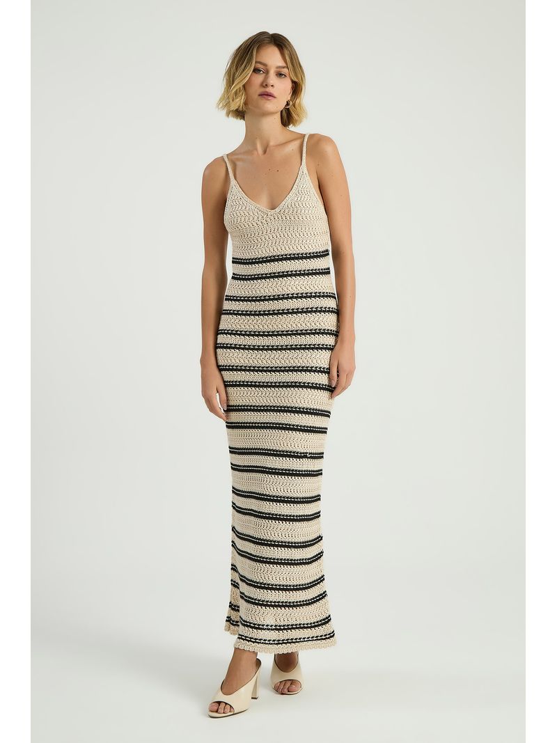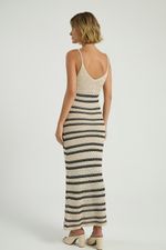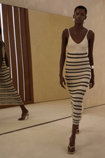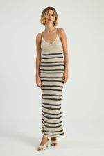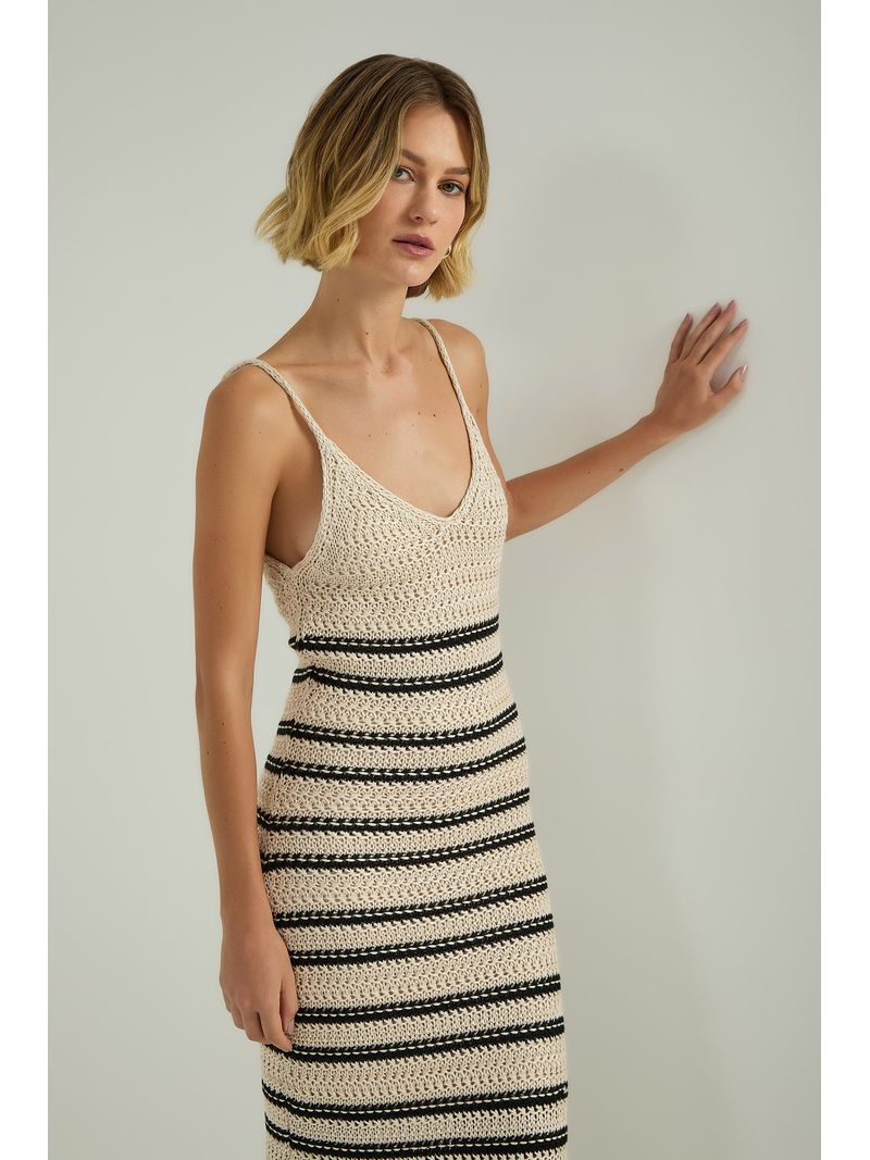 O Vestido listrado, confeccionado em tricot, possui decote em V, alças finas e modelo justo ao corpo. O tricot é um clássico atemporal da moda, perfeito para todas as estações para quem busca um look versátil e confortável.