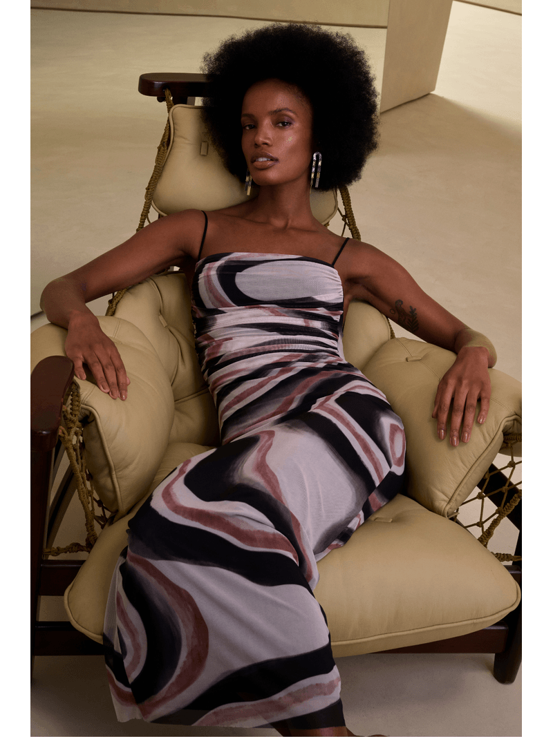 O Vestido, de comprimento longo, foi confeccionado em tule e apresenta decote reto com franzimentos frontais, alças finas com amarração nas costas e modelo justo ao corpo. Ideal para ser usado em ocasiões especiais, trazendo elegância e estilo.